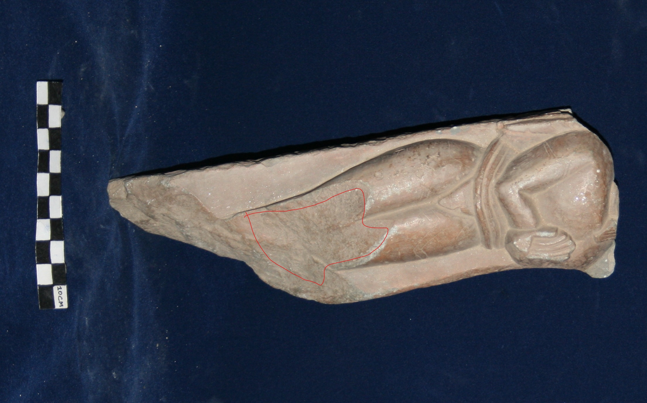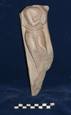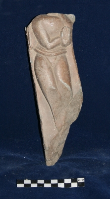 Fragment of standing Male sculpture, head and leg portion is broken. An armlet, griddle can be identified on the deity. He is also depicted wearing a dhoti. His one hand is in Varad mudra.