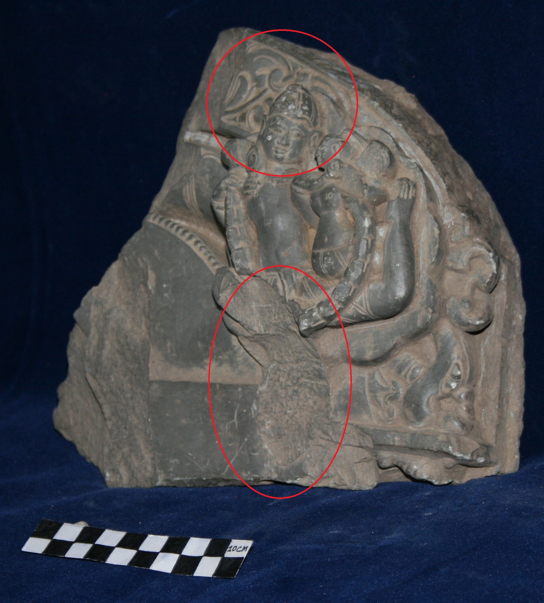 This antiquity is a part of sculpture. Probably upper left part of a sculpture. In this part of the sculpture flying celestials are holding garland in their hands on the right Alongside the celestial a female figure is depicted. Both male and female figure are wearing various ornamentation including crown, earrings, bangles, and necklace. Both are wearing dhoti of similar pattern.
