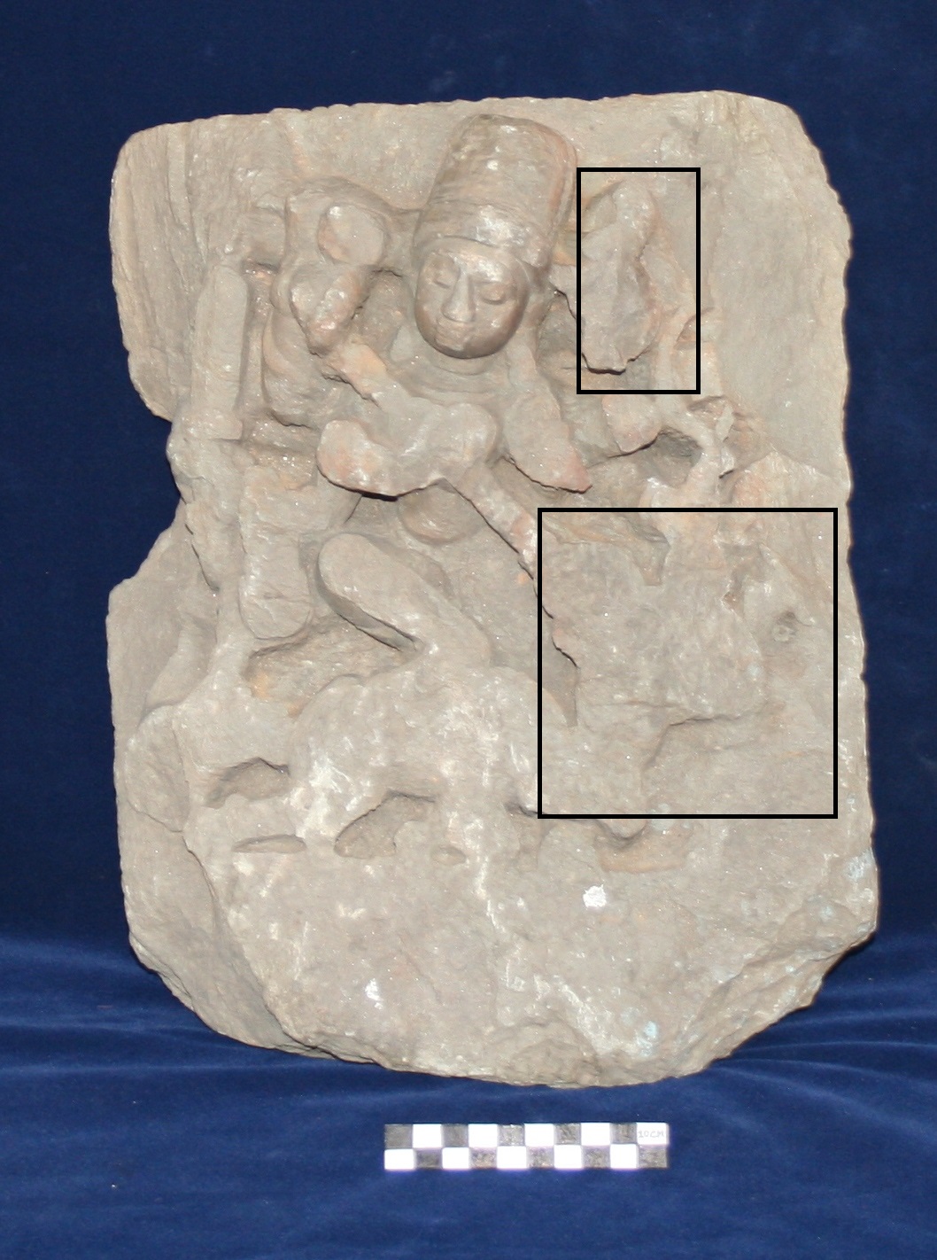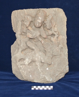 In present sculpture Mahishasurmardini is depicted. She is shown sitting and with multiple hands as most of the sculpture is chipped, total no of hand cant be said specific. Her apart from head and face of the deity al other features of the deity and her surrounding are chipped off.