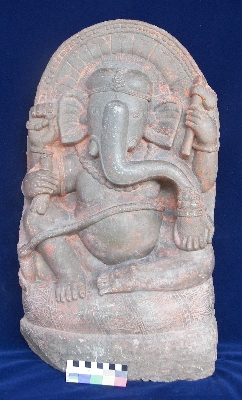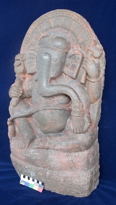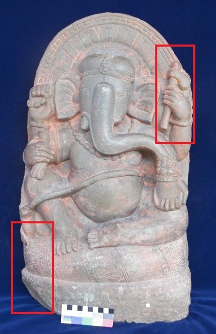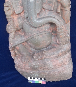 Ganesha is sitting in lalitaasana on a decorative pedestal pillow and depicted with four arms, His trunk is in left direction, eating laddos from his left lower hand. In his right upper hand, he is holding an axe, in lower left hand there is a bowl full of laddos. In his right upper hand he is holding a rosary and in his lower right hand there is a scroll. He is adorned with a headband, bracelet, necklace vagonopavita, dhoti drapery, armlet and a snake waist band. A decorative halo is also depicted behind the head of Ganesha.