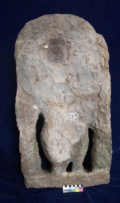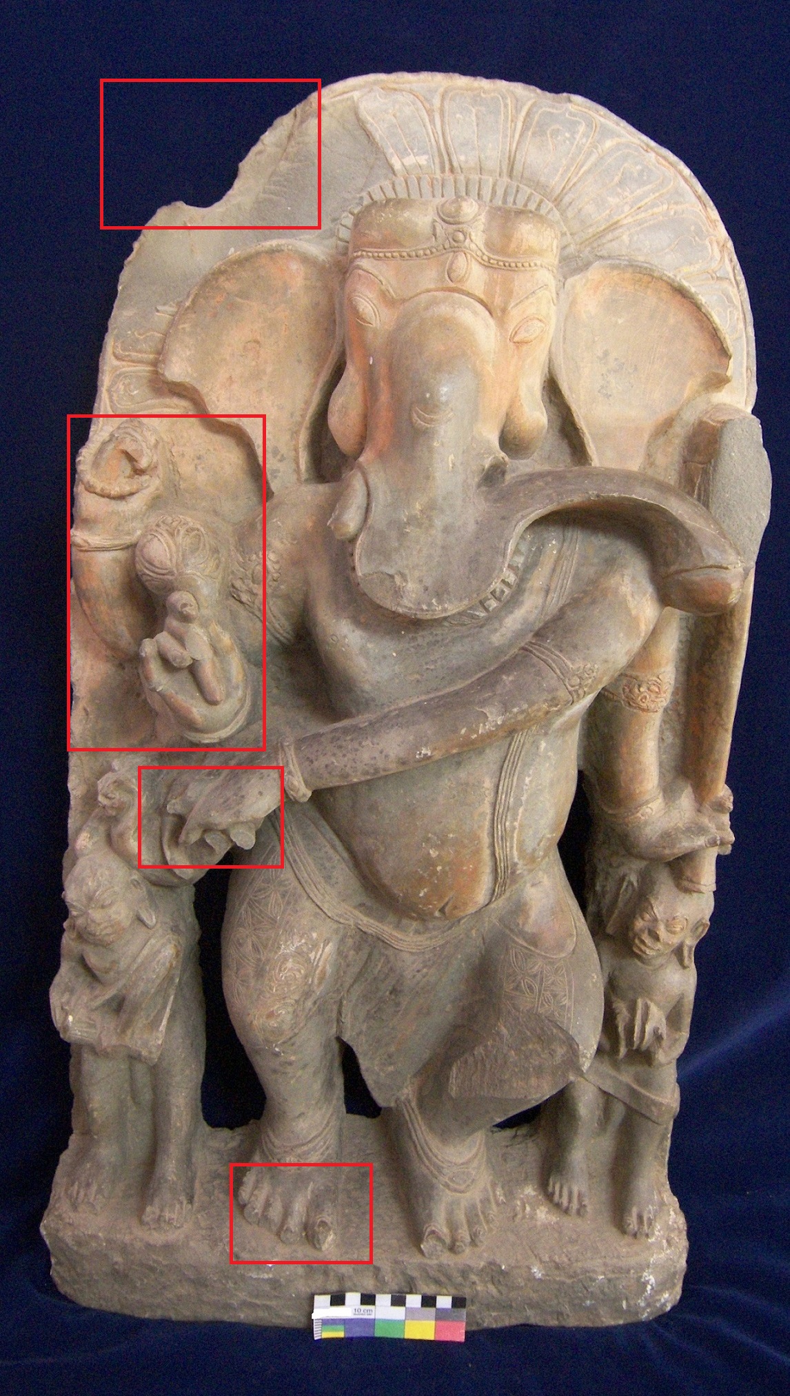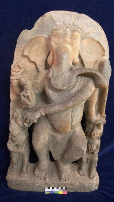 Dancing Ganesha depicted with two attendants on either side near the pedestal. Dancing four armed deity holding Danda in left back hand. He is holding snake in left lower hand, akshamala in right upper and lotus bud in right lower hand. He is depicted wearing bracelet, armlets, anklet, necklace, vagonopavitam and dhoti drapery. Lotus madolian broken on the right side. Trunk on the left side.