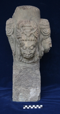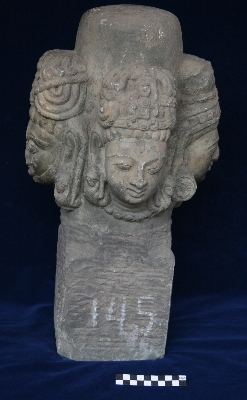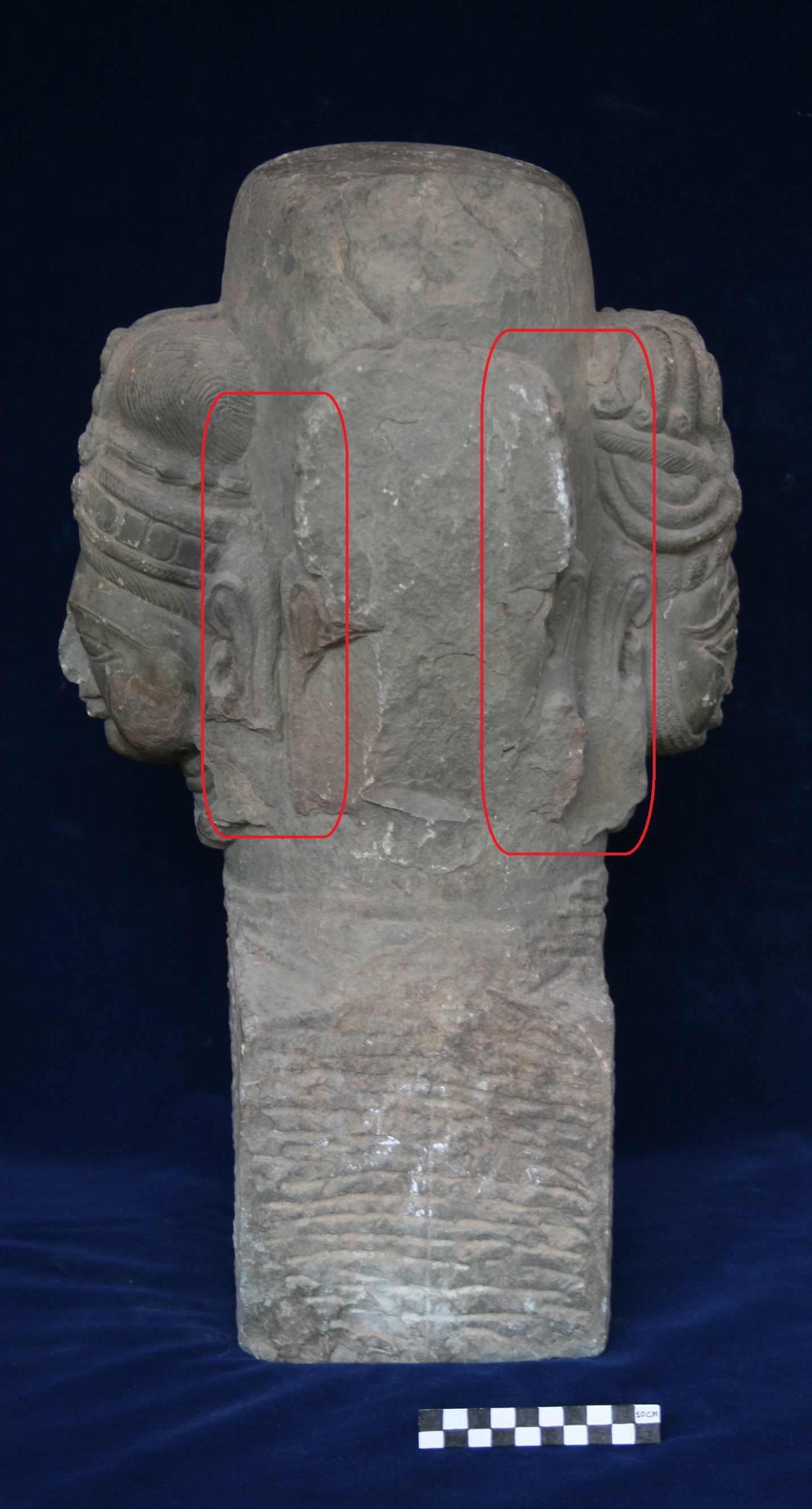 This Chaturmukhi Sivalinga has three faces and , one is broken. Every face has its unique hairdo and facial expression .The faces are depicted adorned with headbands, long hair, beaded necklace and earrings.