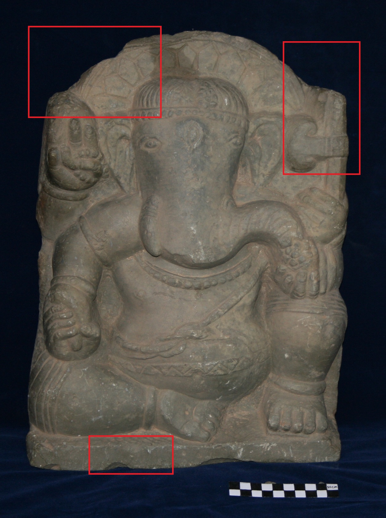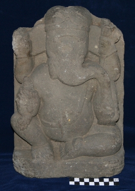 Ganesha is sitting in lalitaasana and depicted with four arms, His trunk is in left direction, eating laddos from his left lower hand. In right upper hand he is holding an axe. In lower left hand there is Sankha. In his right upper hand he is holding a rosary. He is adorned with a headband, bracelet, necklace vagonopavita, dhoti drapery, armlet and a snake waist band.
