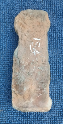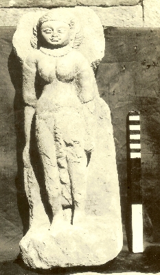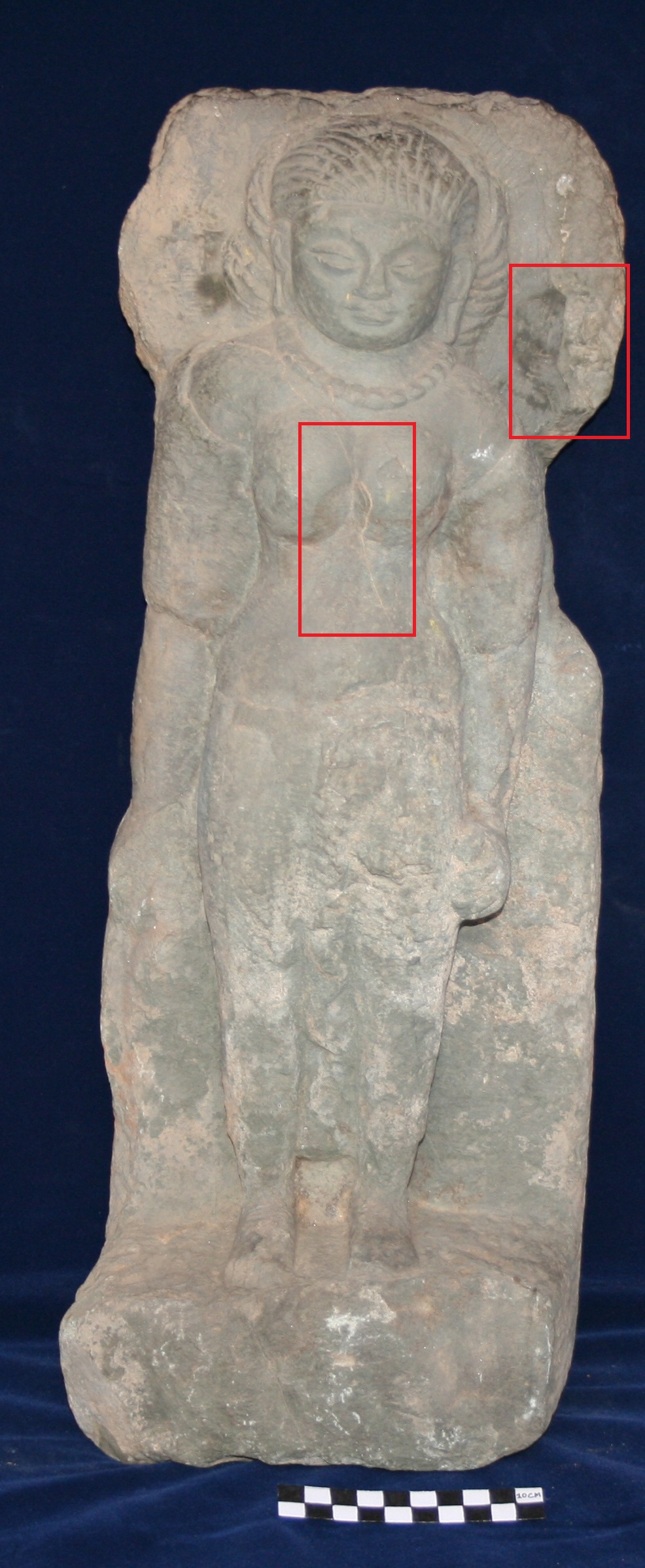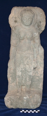 By the look it seems to of a female figure standing. She is adorned with twisted hairdo. The sculpture is highly eroded. She is depicted with beaded necklace and drapery in lower half of her body.