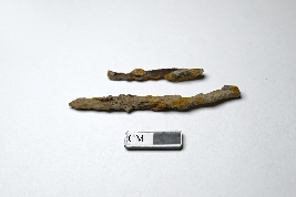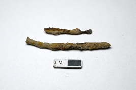 | Description / विवरण | Two rusted iron nails the upper one is too damaged to describe any features; the lower one has a partly visible working edge, while the opposite side is also damaged. The working edge is narrow, and the other end is wider. |