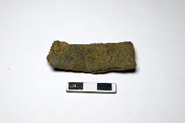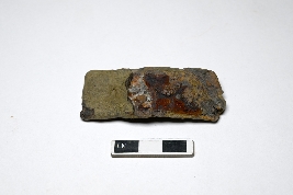 | Description / विवरण | 11. A rectangular iron object with a partly sharp working edge. The object is rusted and likely served as part of a weapon or a household tool. |