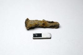 | Description / विवरण | A rusted iron nail with a partly visible working edge; the opposite end is also damaged. The working edge is narrow, and the other side is wider. |