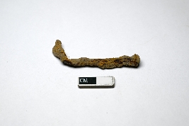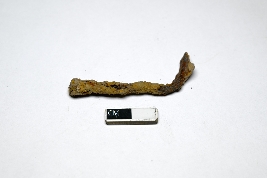 | Description / विवरण | A rusted iron nail with a bent, partly visible working edge; the other end is also damaged. The working edge is narrow, and the opposite end is wider. |