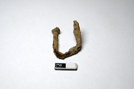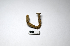 | Description / विवरण | A rusted iron nail with a bent, partly visible working edge; the other end is also damaged. The working edge is narrow, and the opposite end is wider. The object is U-shaped. |
