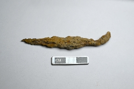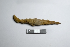 | Description / विवरण | A rusted iron nail with a visible working edge, while the other edge is damaged. The working edge is narrow, while the opposite side is wider and bent. |