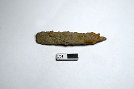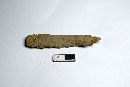 | Description / विवरण | A rusted iron nail with a visible working edge, while the other edge is damaged. The working edge is narrow, while the opposite side is wider. |