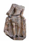 | Description / विवरण | Broken image of dwarapalaka. Head mutilated. Only the torso and lower parts are available. There are necklaces above the chest, besides yajnopavita and udarabandha. The lower part of the right hand is broken while the left hand rests on the mace. Drapery contains a lower garment in three straps with the long flowing tassel in the middle. In the bottom on the left side is monkey holding a baby. Lean in proportion. Seems to be of Rashtrakuta School of Art. |