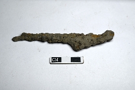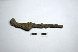 | Description / विवरण | A rusted iron nail with a visible working edge, while the other edge is damaged. The working edge is narrow, while the opposite side is wider and almost triangular. |