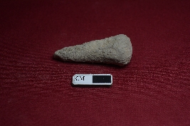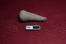 | Description / विवरण | A terracotta stopper that is grey in color with a rough surface. One side is pointed, while the other side is almost rounded. |
