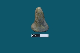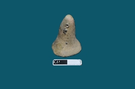 | Description / विवरण | A terracotta gamesman that is grey in color with a rough surface. One side is pointed, while the other side is flat. The shape is almost conical. A small perforation is visible. |