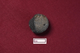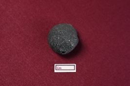 | Description / विवरण | Terracotta ball with a small hole on one side, possibly intended as a bead. The object is broken on one side and blackish in colour. |