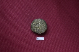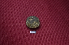 | Description / विवरण | A fragmented terracotta sling ball, black in colour, with a rough surface. |
