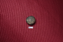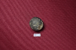 | Description / विवरण | A terracotta sling ball, black in colour, with a smooth surface. A depression is visible. |