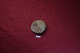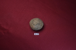 | Description / विवरण | A fragmented terracotta sling ball, red in colour, with a rough surface. |