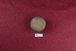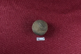| Description / विवरण | A terracotta sling ball, grey in colour, with a noticeably rough exterior. |