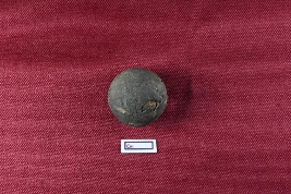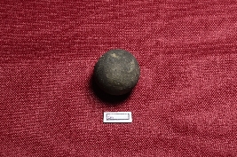 | Description / विवरण | A black terracotta sling ball, featuring a smooth surface. |