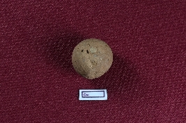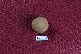 | Description / विवरण | A red terracotta sling ball, circular in form, featuring a fine surface. |