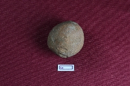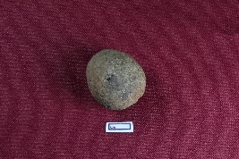 | Description / विवरण | A terracotta sling ball, almost grey in colour and nearly circular in shape, with a noticeably smooth exterior. |
