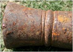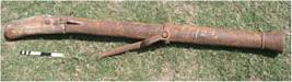 | Description / विवरण | It is a light gun cast in iron known as musket. This gun has a long parallel bodied cylinder with narrow calibre provided with short trunnions further engaged with a fork swivel. Thick ring comprising trunnions is decorated with incised lines. The muzzle astragals are also decorated with oblique incisions. An inscription is engraved on the breech. The vent hole is seen on the right side of the breech with flash pan. The gun has flat cascabel fixed in a wooden butt using iron nails. It is provided with fore site point on muzzle rim and back site U on the breech now seen in form of an empty groove. |