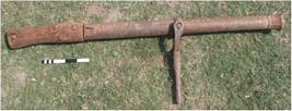 | Description / विवरण | This is a light gun cast in iron. The chase and muzzle of the gun are faceted and octagonal in section. The muzzle face has out flaring rim decorated with design like flower petals. The portion between first and second reinforcement rings is decorated with V shaped appliqu design in iron. Breech of this gun is decorated with similar design. A thick flat ring in the middle of the chase accommodates trunnions are formed by combining two rods in to a ring having two projection. These are further engaged with a fork swivel. An inscription is engraved on the chase. The cannon is provided with two reinforcement rings in copper near muzzle. The cascabel is flat rectangular strip fixed in wooden butt with iron nails. The vent hole is seen on the right side of the breech with flash pan. and back site U on the top. For aiming, gun is provided with fore site point on muzzle rim and back site U on the breech now seen in form of an empty groove. |