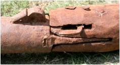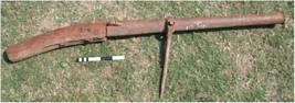 | Description / विवरण | This is a small hand gun known as matchlock cast in iron. This gun held a burning slow match in a clamp at the end of a small curved lever known as the serpentine. Upon the pulling of a lever protruding from the bottom of the gun and connected to the serpentine, the clamp dropped down, lowering the smouldering match into the flash pan and igniting the priming powder. The barrel is attached with wooden butt using iron straps by using iron nails. The gun with cylindrical body tapering from breech to mouth is provided with thick rim. The trunnion is provided in form of two bars forming ring around barrel and joining each in form of short extensions on the either side engaged with a fork swivel for moving it in a vertical or horizontal plain. The gun bears two inscriptions. The vent hole is provided on the right side of the breech along with flash pan. For aiming, gun is provided with fore site point in form of a groove on muzzle rim and back site U on the breech now seen in form of an empty socket. |