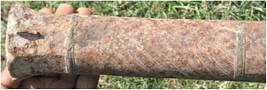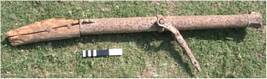 | Description / विवरण | This is a small gun cast in iron known as a shaturnal . The chase and muzzle of the gun is faceted and is octagonal in section. The muzzle face has out flaring rim. The portion between first and second reinforcement rings is decorated with V shaped appliqu design in iron. Breech of this gun is decorated with similar design. The trunnions are formed by combining two rods in to a ring having two projections. These are further engaged with a fork swivel. An inscription is engraved on the breech portion. The cannon is provided with thee reinforcement rings in copper two near muzzle and third near breech portion. The cascable is flat rectangular strip with two perforations engaged with iron nails to fix wooden butt which is partially damaged. The vent hole is seen on the right side of the breech with protection. The muzzle is provided with fore site point but back site U on the top portion of breech is missing only empty socket is seen now. |