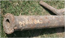 | Description / विवरण | This is a small gun cast in iron known as a shaturnal . The barrel of the gun is faceted and octagonal in section. The muzzle mouth is out flaring with simple rim rim. The trunnions are formed by combining two rods in to a ring having two projections. These are further engaged with an iron fork swivel. An inscription is engraved on the chase portion. The cannon is provided with astragals on muzzle, chase near trunnion and on breech. The cascable is flat rectangular strip with three perforations to fix gun with wooden butt which now missing. The vent hole is seen on the breech. The muzzle is provided with fore site point but back site U on the top portion of breech is missing only empty socket is seen now. |