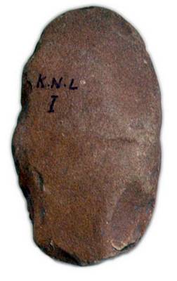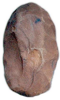 | Description / विवरण | Hand Axe oval in shape made on river rolled pebble with block on block technique, retained pebbly cortex partly, straight lines of profile indicate tool is fully finished. Functional edge and ventral surface show flake scars. |