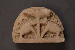 | Description / विवरण | Semi circular stone showing two boar figures touching the pole of a chatra from either side. There are a few animal of smaller size too in the scene. |