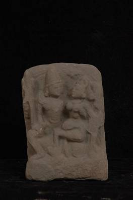 | Description / विवरण | Sculpture showing Siva-Parvati seated in alinganamudra. Parvati is seated in the lap of Siva, bull is shown below the seat. Badly damaged. |