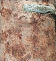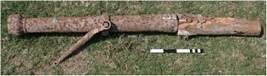 | Description / विवरण | This is a small hand gun cast in iron known as a shaturnal . The cylinder of the gun appears almost parallel but it slightly tappers from towards muzzle with flaring out mouth. A reinforcement ring is provided on muzzle neck provided with muzzle face shaped as lion s mouth without flaring rim. The portion between first and second reinforcement rings is decorated with V shaped appliqu design in iron which is in warned out condition now. Breech of this gun is decorated with similar design. The trunnions are formed by combining two rods in to a ring having two projections. This ring is also decorated with V shaped design. The second reinforcement ring separating muzzle from chase portion is made of which is in damaged condition. The cascabel is fixed to wooden butt now in damaged condition with iron nails. The vent hole is seen on the right side of the breech with flash pan. The back site U on the top portion of breech is missing only empty socket is visible now. |