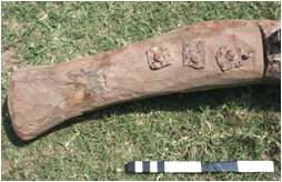 | Description / विवरण | This is a hand cannon cast in iron. The cylinder of the gun appears almost parallel but it slightly tappers from towards muzzle with flaring out mouth. An astragal ring joins muzzle with chase. The short trunnions are provided on an iron strap around barrel of the gun further engaged with an iron fork swivel with pointed end having perforation. The cascabel is fixed to wooden butt with iron nails. A vent hole is seen on the breech with flash pan. An inscription on the breech near trunnion portion is also noticed. The fore site point is provided on muzzle and back site U on the top portion of breech which is missing now and only empty socket is visible. |