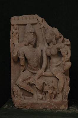 | Description / विवरण | Seated Uma-Mahesvara on the upper right corner of a damaged large image. Siva is four-armed and carries trisula in the upper left hand. Parvati carries infant Skanda in her lap. Ganesa stands between the feet of the divine parents. Traces of lingas are seen above Siva s head. |