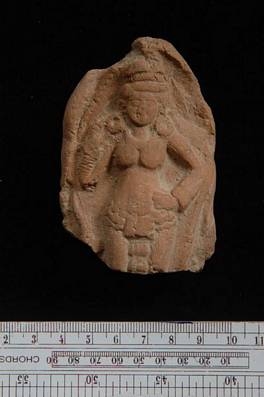 | Description / विवरण | Terracotta plaque showing a lady standing and holding right earring with right hand. Her left hand rest on her hip. She wears a pagree on her head and multi stringed girdle on the waist with a pataka hanging in front. Legs partly gone. |