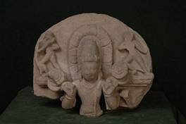 | Description / विवरण | Upper part of stele showing bust of Surya holding full blown lotus stalk in the two hands. Surya dons a kiritamukta figured against an oval lotus halo, which is flanked by figures of Usa and Pratyusa shooting arrows. Surya also wears kundalas, torque, kavaca, yajnopavita and wristlets. |