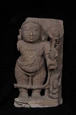 | Description / विवरण | The two right arms of the pot-bellied god are missing. The upper and lower left arms hold the discus and the conch. He wears an upavita, a narrow scarf and a vanamala in addition to the usual necklaces and other ornaments. No crown is present, the hair is dressed in curled ringlets and the lotus has a beaded edge. To the side is a seated worshipper in anjali mudra and a standing male attendant carrying a cauri. De Mallmann, Les enseignements iconographiques, pp. 32-35, has suggested that images of this type, particularly when the crown is present, may be representations of Adi Vasudeva and not Vamana. |