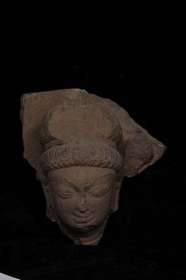 | Description / विवरण | The hair is done in a large bun secured by a fillet small curls of hair fringe the forehead on which can be discerned traces of the third eye the eyebrows are ridged and the pupils of the eves clearly delineated. The ears have long lobes and are unadorned. |