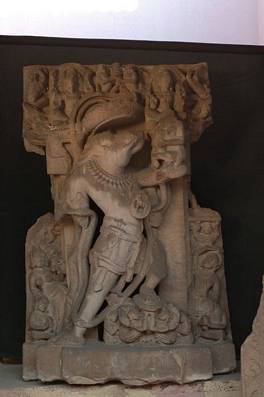 | Description / विवरण | The god stands with the right leg planted on the ground and the raised left foot resting on a lotus held by Adi Sesa and his consort. The right arm is damaged the left arm holds the discus near the stomach and supports Prthvi on the elbow. It is not clear if the image had two or four arms. The god is shaded by a large drooping lotus, the stalk of which rises from the ground. To his right is Kamala and a seated female devotee to the left, Garuda with one arm raised in a laudatory gesture and a seated male worshipper. Above them were bharavahaka Yakas supporting vyalas, now missing, on top of which were makara heads with riders, one of these being clearly preserved. Above the god are the badly damaged figures of a pair of flying Devas and what appear to be figures of Brahma and Siva. |