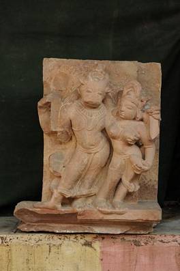 | Description / विवरण | Vasu and his consort. Fragment of a temple wall.The attributes in the hands of the god have broken away but traces of the book held in the upper left hand are visible. The goddess holds a matulunga in the left hand. |