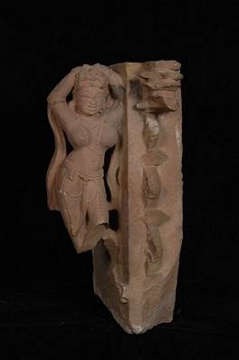 | Description / विवरण | A female figure carved in the round projects from a block of stone decorated with a damaged pilaster. She has crossed her hands above the head. |
