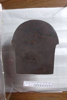 | Description / विवरण | Object has round thin cutting edge. There is clear kink at the point where the curved edge meets the main body. Main body is straight and flat but end. Surface is smooth without any marks of beating. Few black patina marks are identifiable on surface. |
