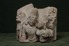 | Description / विवरण | Bust of Uma-Mahesvara in alingana-mudra. Upper left hand of Mahesvara carries serpent while the god caresses Uma s breast with his lower left hand, right hands broken. Ganesa is seated on the top left of the stele and probably Kubera on the top right. |