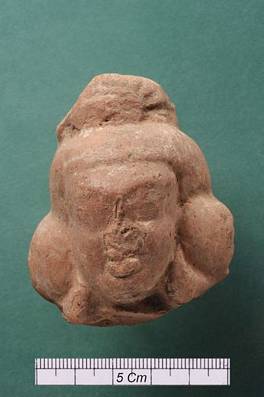 | Description / विवरण | Terracotta head. Hair arranged upwards. Nose damaged. Part of headdress injured. |