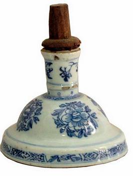 | Description / विवरण | Candle stand of porcelain ware with blue flower designs. |