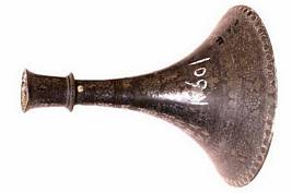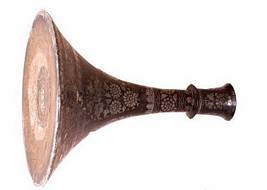| Description / विवरण | It has circular flat base with conical long neck and circular opening with splayed out thick rim. A prominent ring below the rim. Rich inlay work with foliage and geometrical designs. |